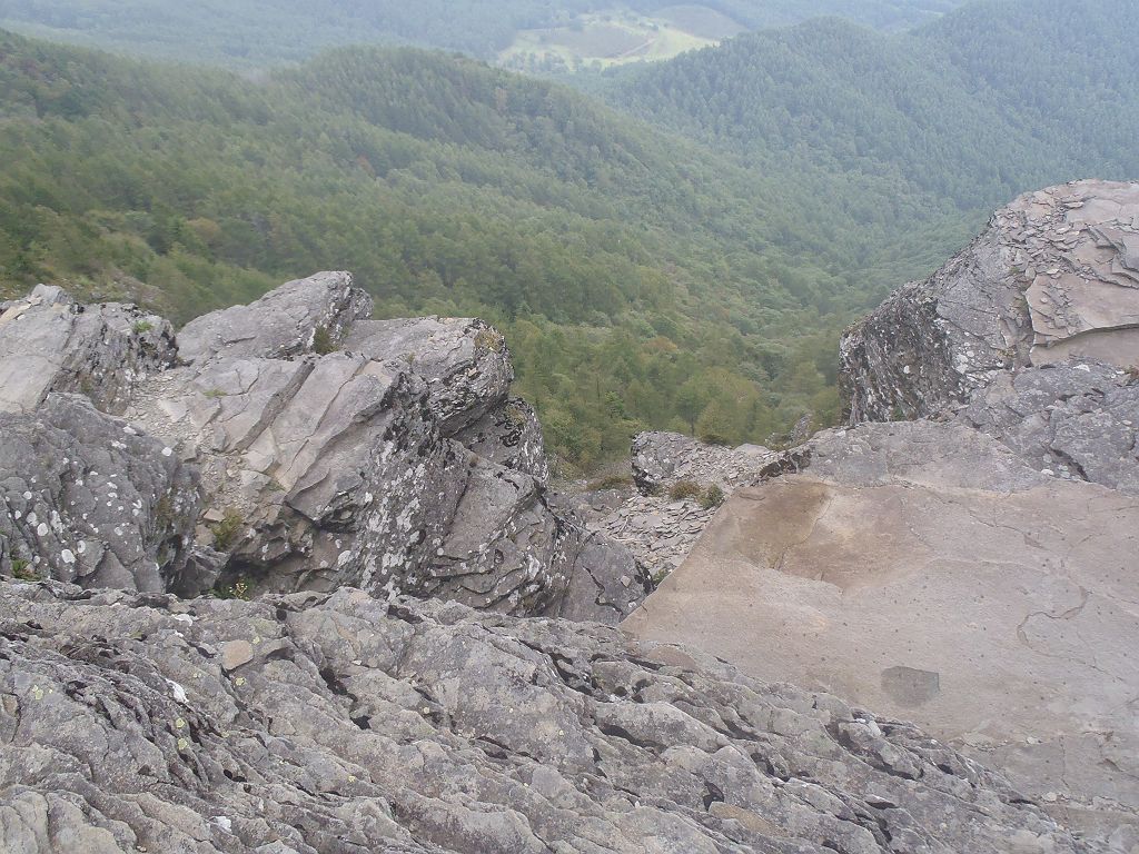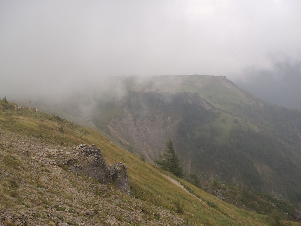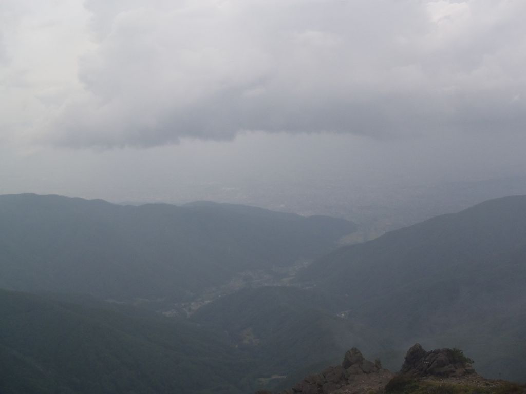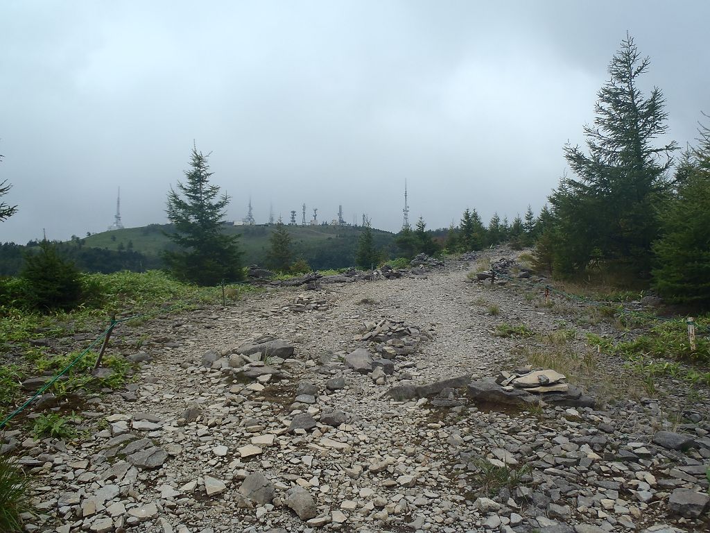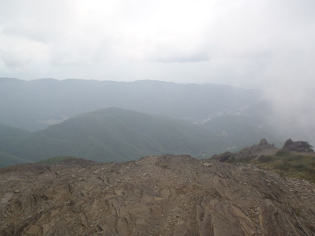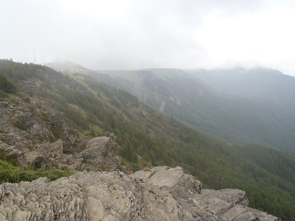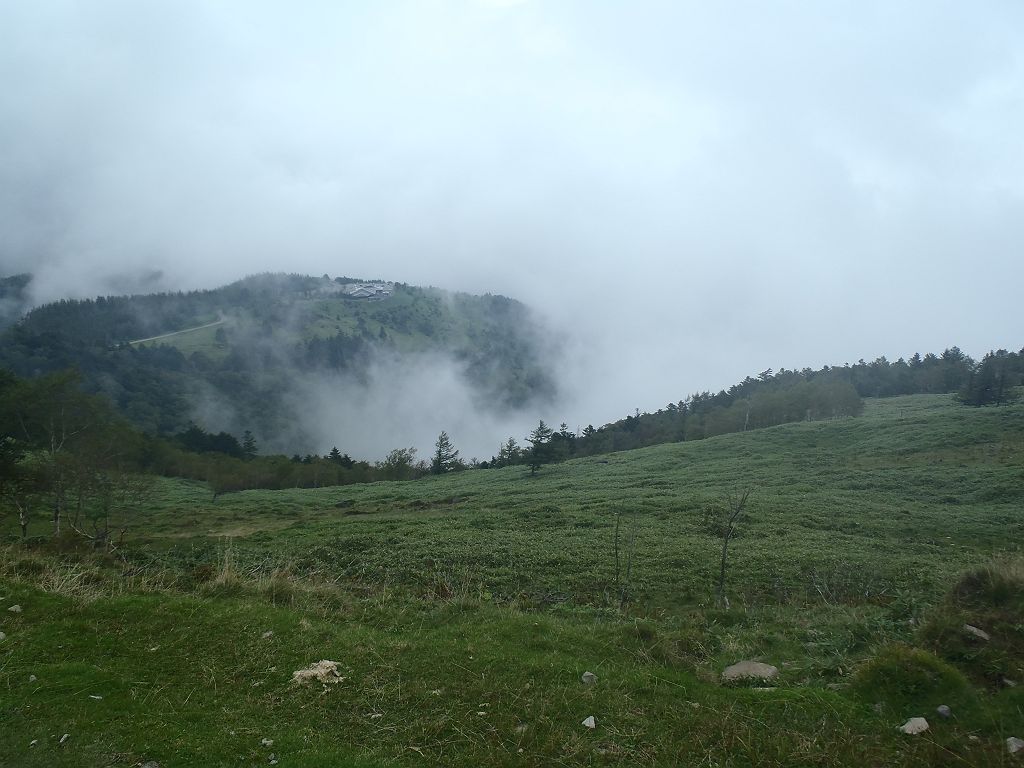 山頂の岩上より美ヶ原高原を望む。ガスってるが、天気がよければこんな感じに見える。