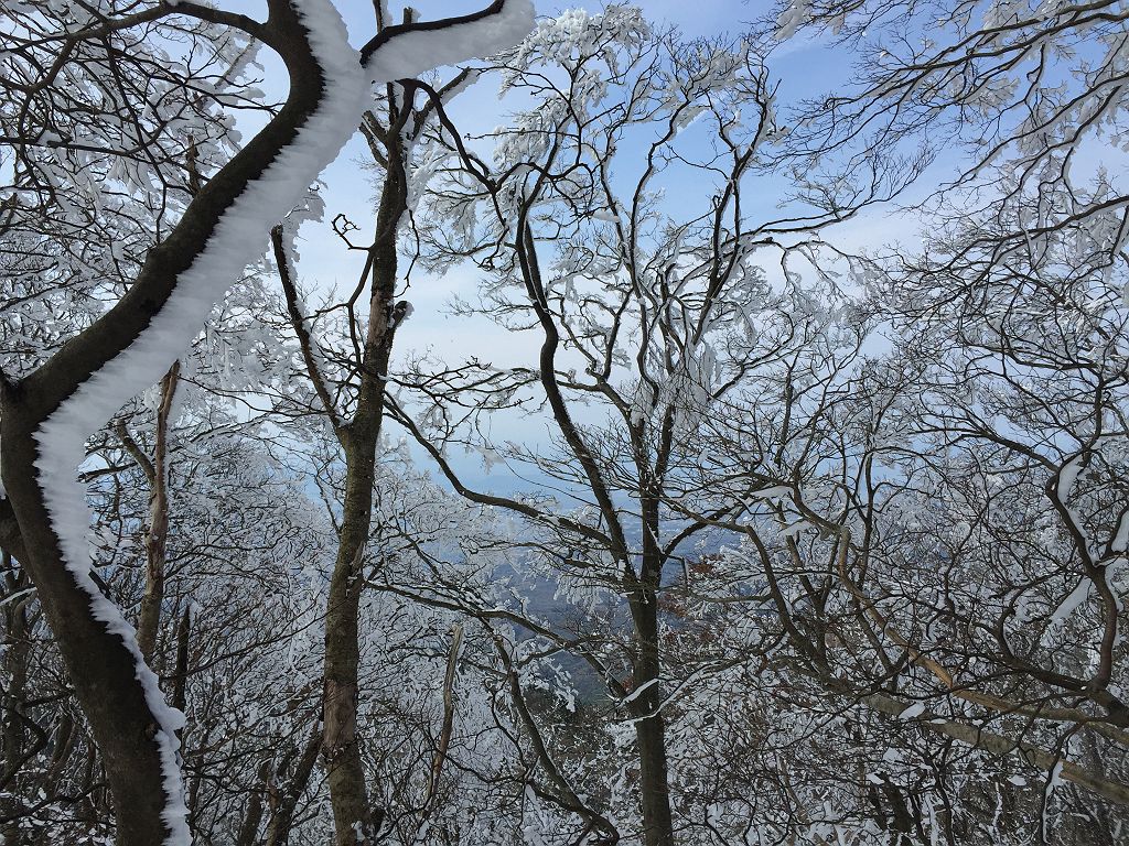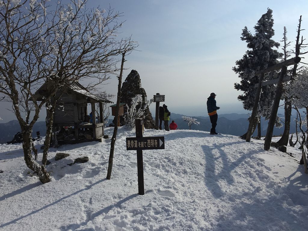 今シーズン初の雪山、冬の八ヶ岳にいくのでS嬢の初アイゼンと冬靴の慣らしとトレーニングもかねて、鈴鹿山脈の綿向山に行ってきました。朝早くスタートしたのに国道を一本間違えて、国道421号線、永源寺のほうにいってしまい一時間ロスしました。なんとか国道477号線に入れました。駐車場からヒミズ谷出合小屋までがちょい長い感じがしたのと、小屋の標高460m~山頂の1110mの標高差650mで距離が4.3kmとかなりだらだらするんだろうなと思いつつ、歩いてみると一合目~三合目までが景色も変わらずかなり長く感じました。七合目より冬季ルートは直登ですが、これがかなりしんどい。樹氷もちらほらありながらも、快晴だったのがすっかり真っ白に曇ったのでもう景色はあきらめていました。ところが、山頂の手前あたりで青空がでてきてラッキー!写真でわかりにくいですが、肉眼ではいいものが見れました。S嬢も靴とアイゼンに慣れたようなのでよかったです。