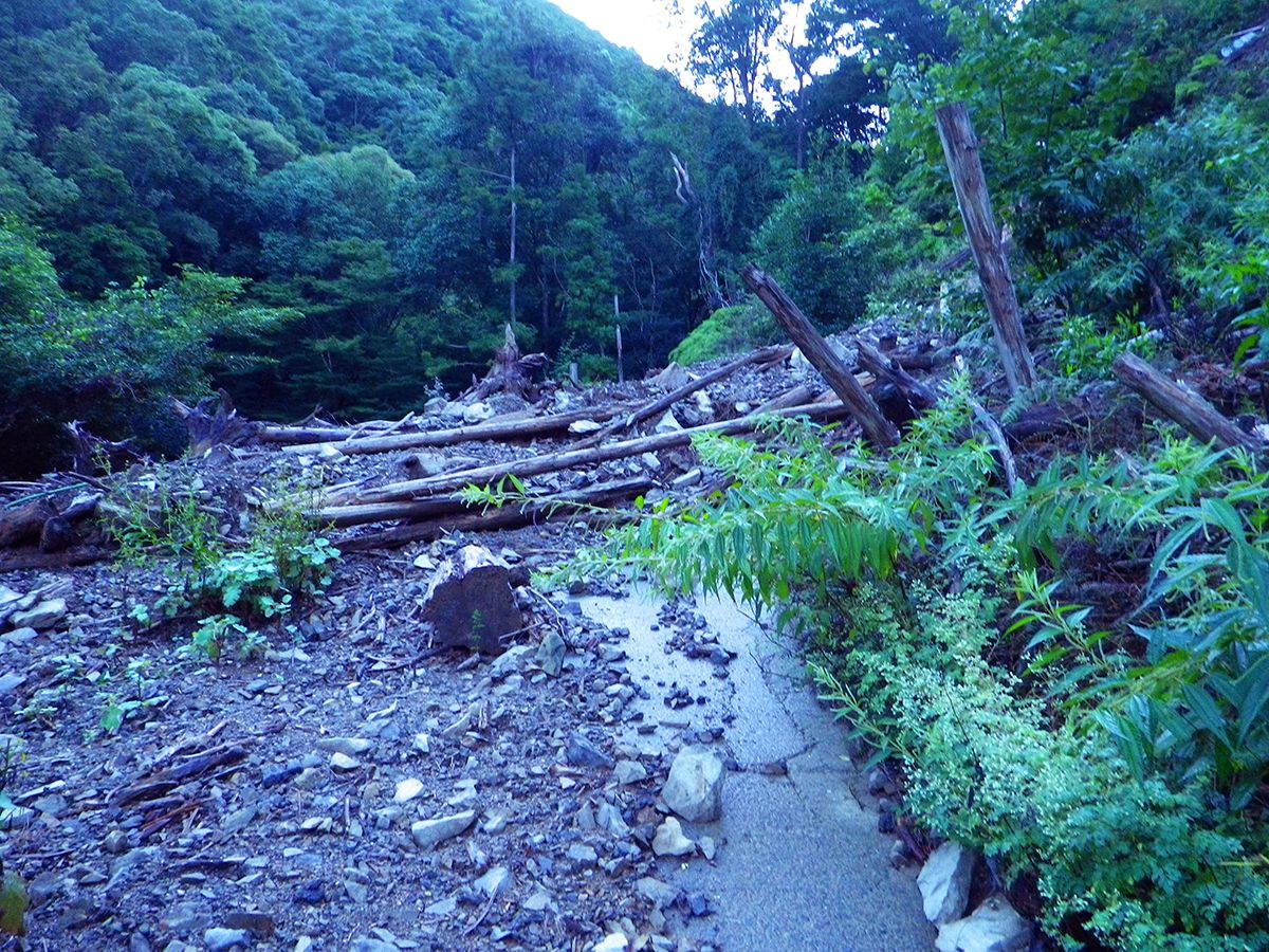 途中で林道が土砂が崩落していた。かなり規模が大きかったように思える。ここを無理矢理こえていくが、この先にも土砂が崩落していた場所があった