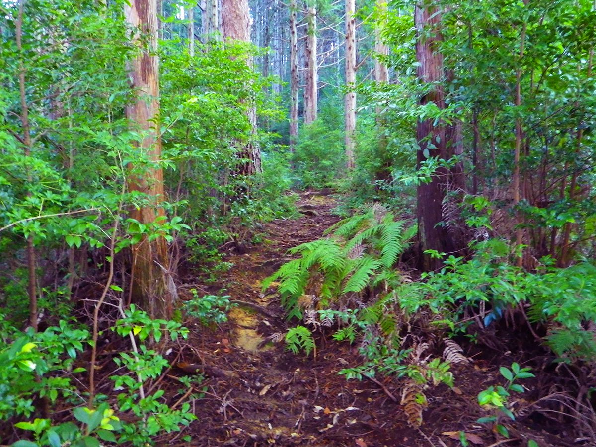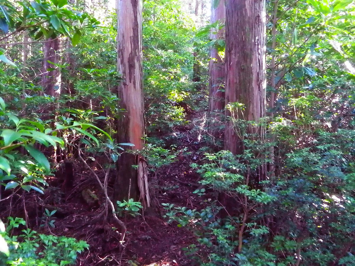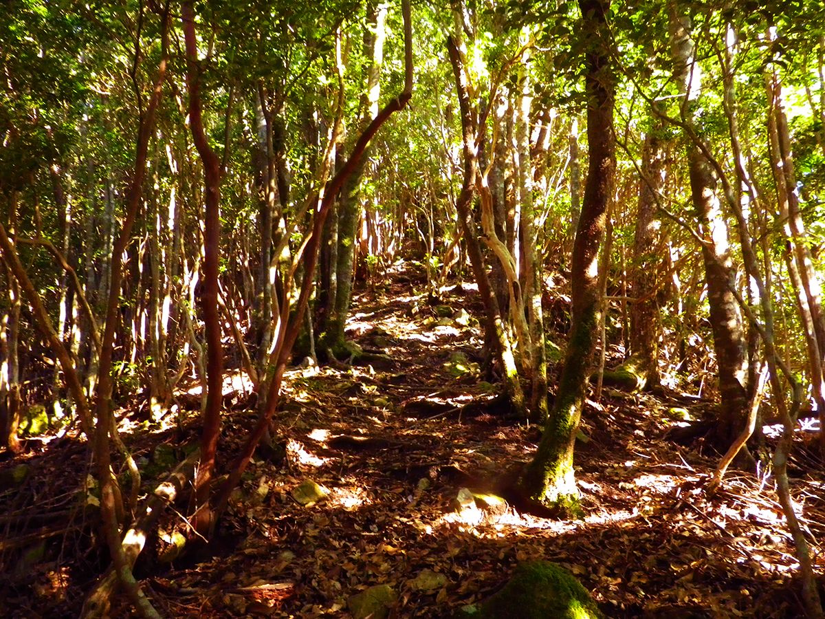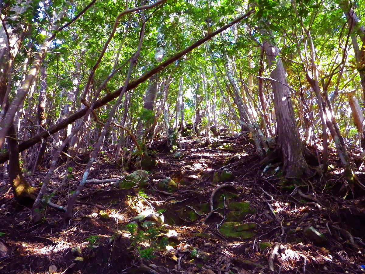 階段が終わって少し登ると尾根道だけど、わずかな踏み跡しかないところを歩いていく。この付近からなだらかな尾根道になる