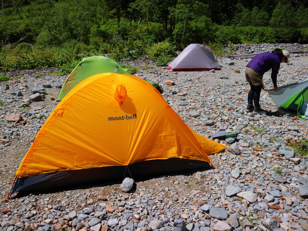 槍平小屋のキャンプ場に到着。かなり早く着いた。テントを片付けて下山する